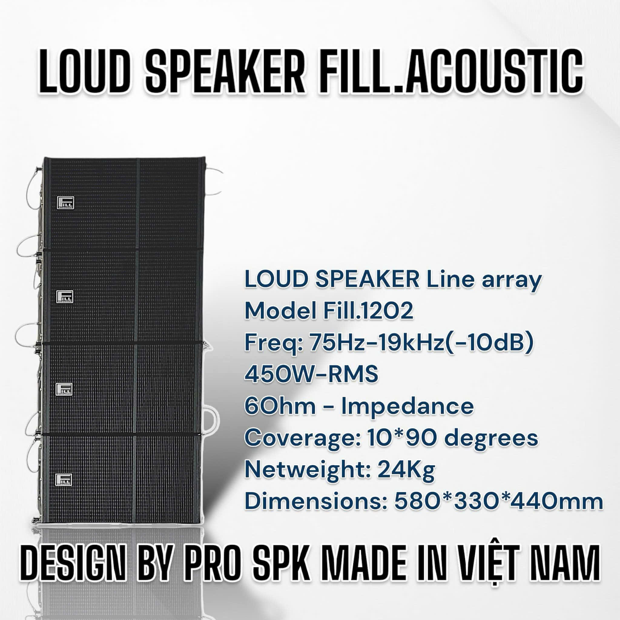 LOA LINE ARRAY Model: Fill.1202 Dải tần số: 75 Hz – 19 kHz (±10dB) Công suất RMS: 450 W Trở kháng: 6 Ohm Góc phủ âm: 10° (dọc) × 90° (ngang) Khối lượng tịnh: 24 kg Kích thước (DxRxC): 580 × 330 × 440 mm